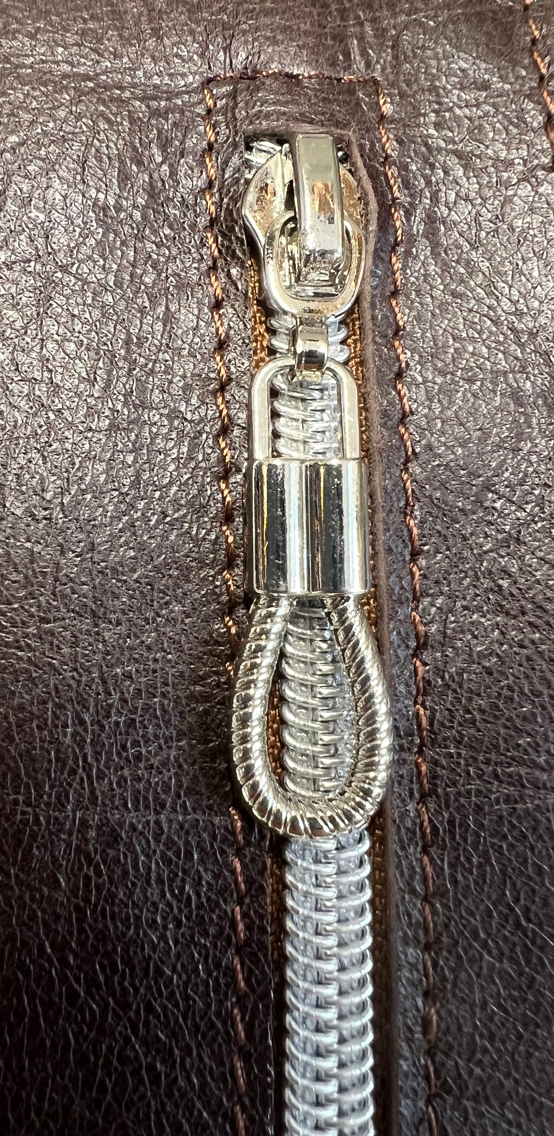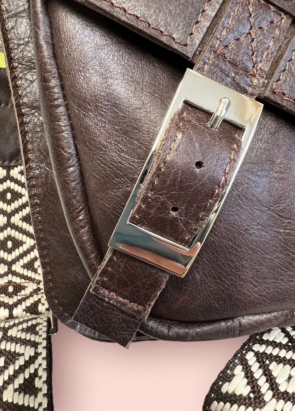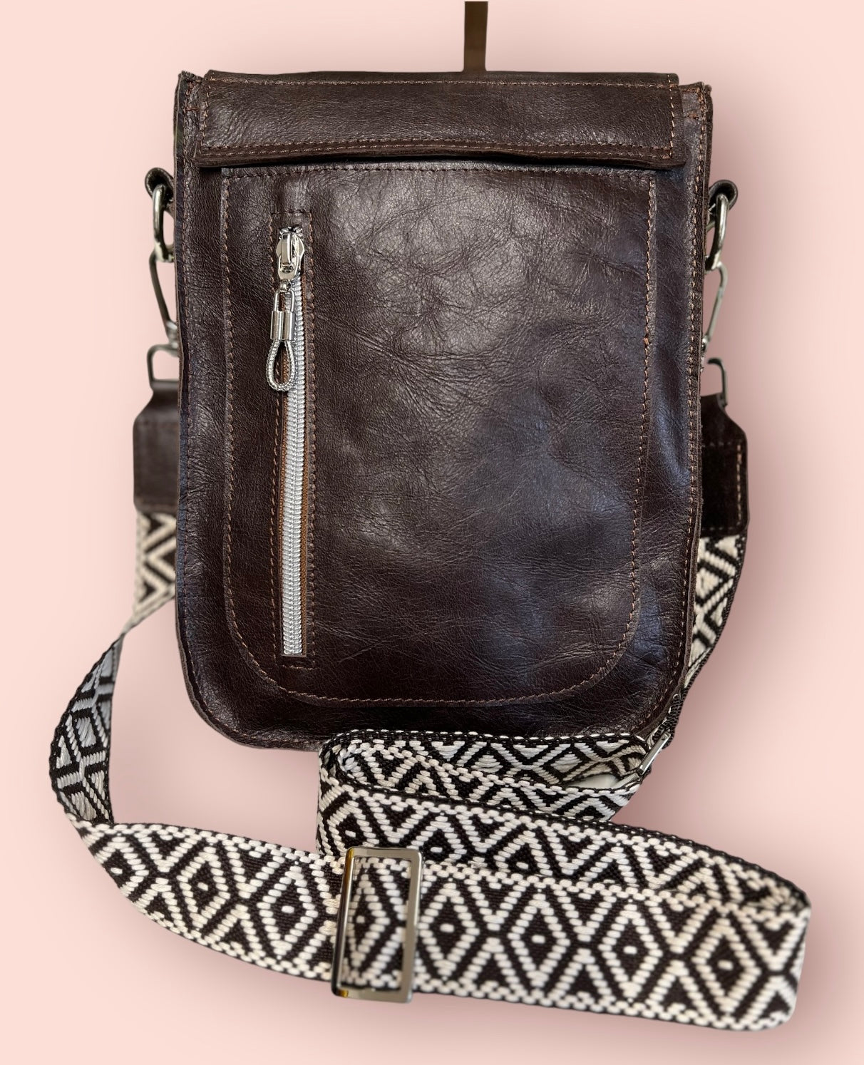 The Messenger Crossbody Bag is an all-leather raw edge bag, dark brown distressed look leather with silver effect hardware, the large front flap has an external zippered pocket with a buckle effect fastener with a magnet closure on the back. It has an external zippered pocket with a large slip pocket. The main opening is secured with a zippered placket to keep your belongings safe. On the rear of the bag there is a smaller zippered pocket. The Messenger Crossbody Bag comes with a detachable and adjustable 1.5inch wide nylon strap with silver effect hardware and leather accents with swivel hooks.