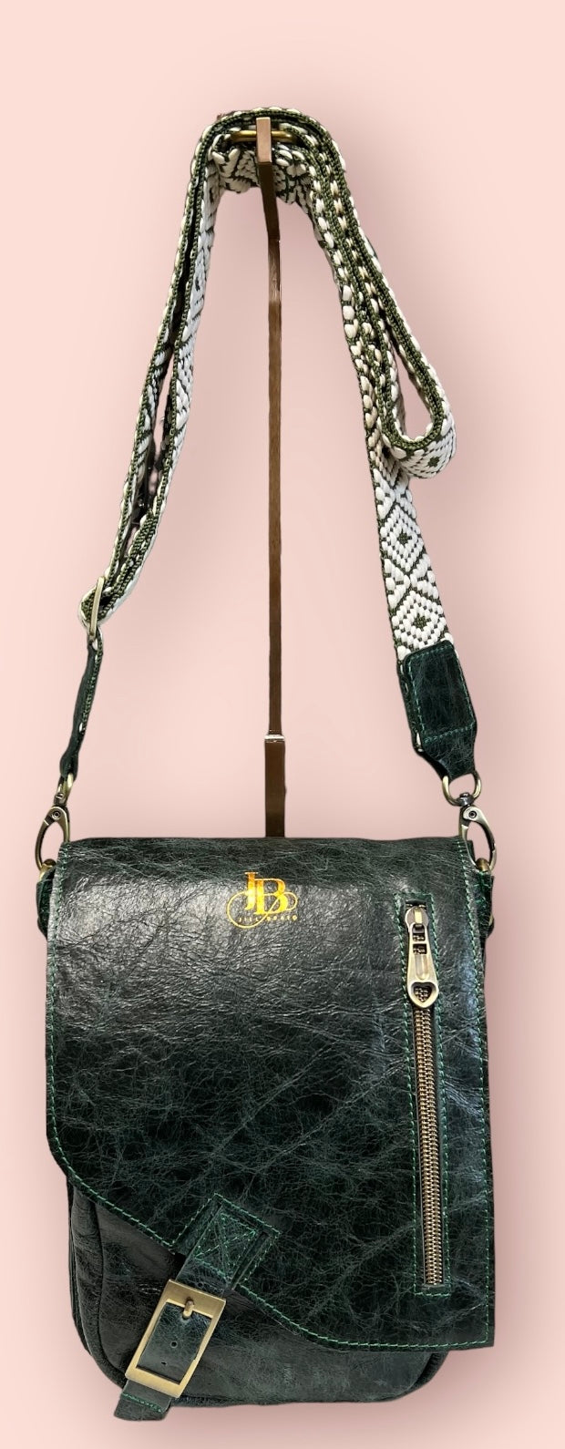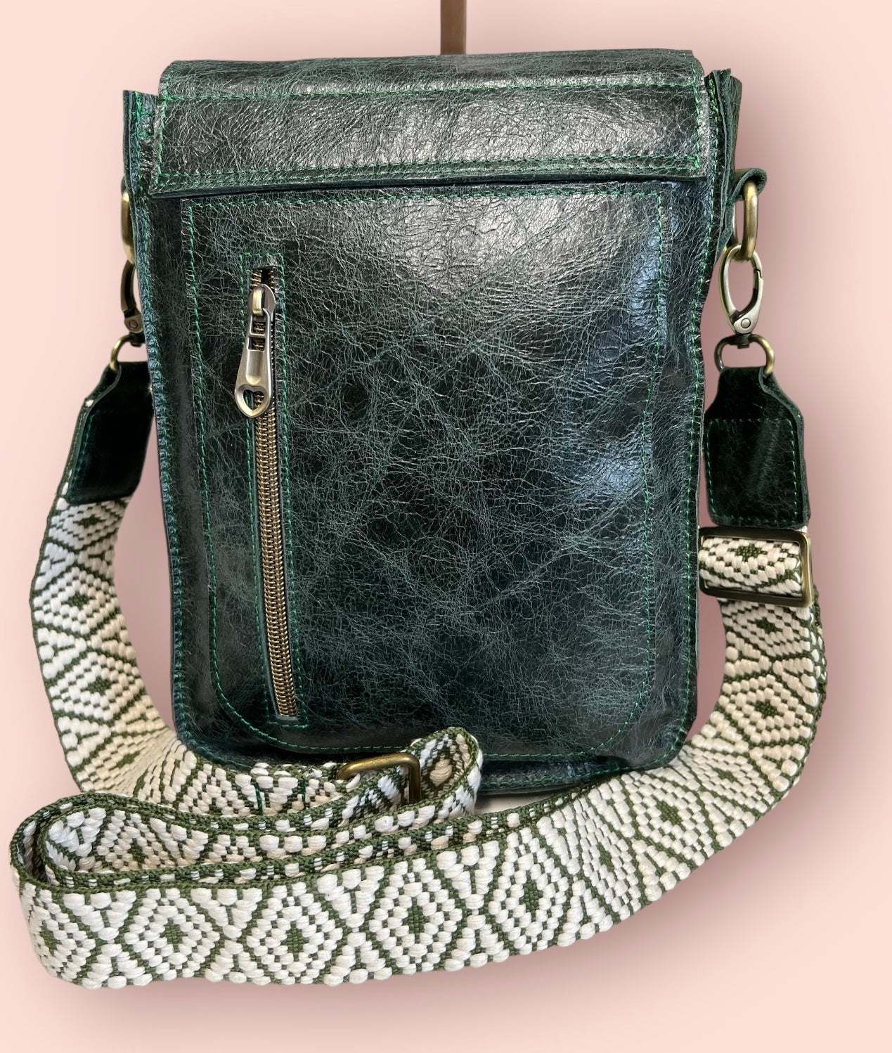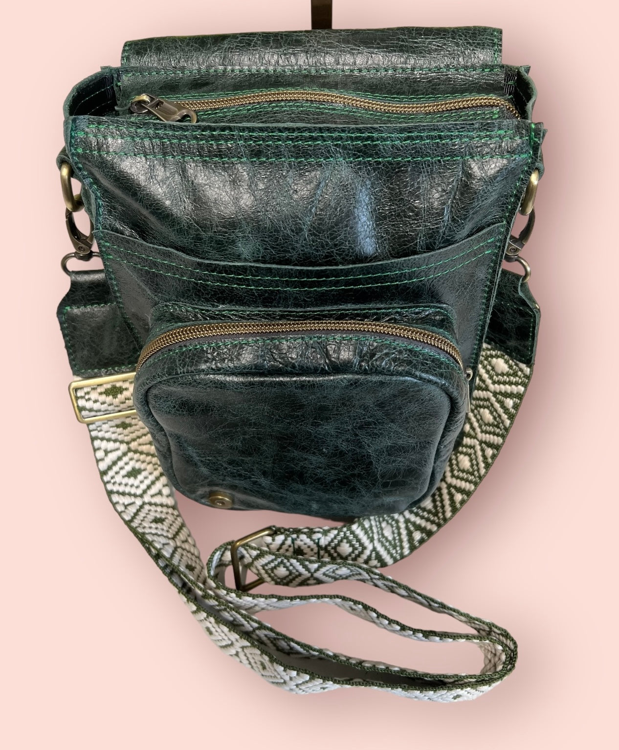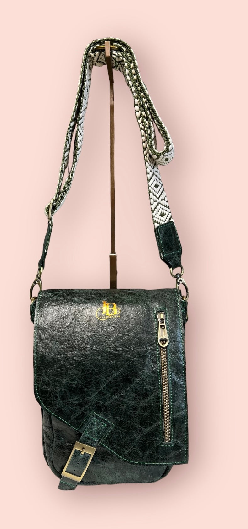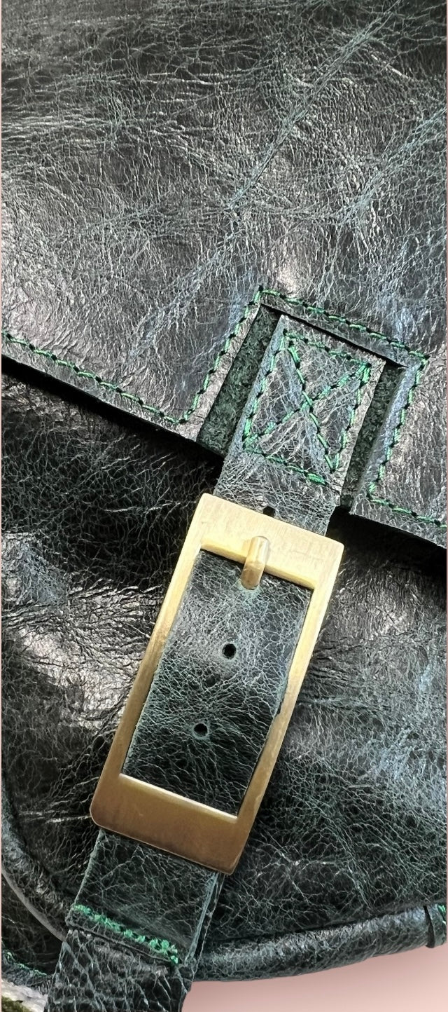 The Messenger Crossbody Bag is an all-leather raw edge bag, green distressed look leather with brass effect hardware, the large front flap has an external zippered pocket with a buckle effect fastener with a magnet closure on the back. It has an external zippered pocket with a large slip pocket.