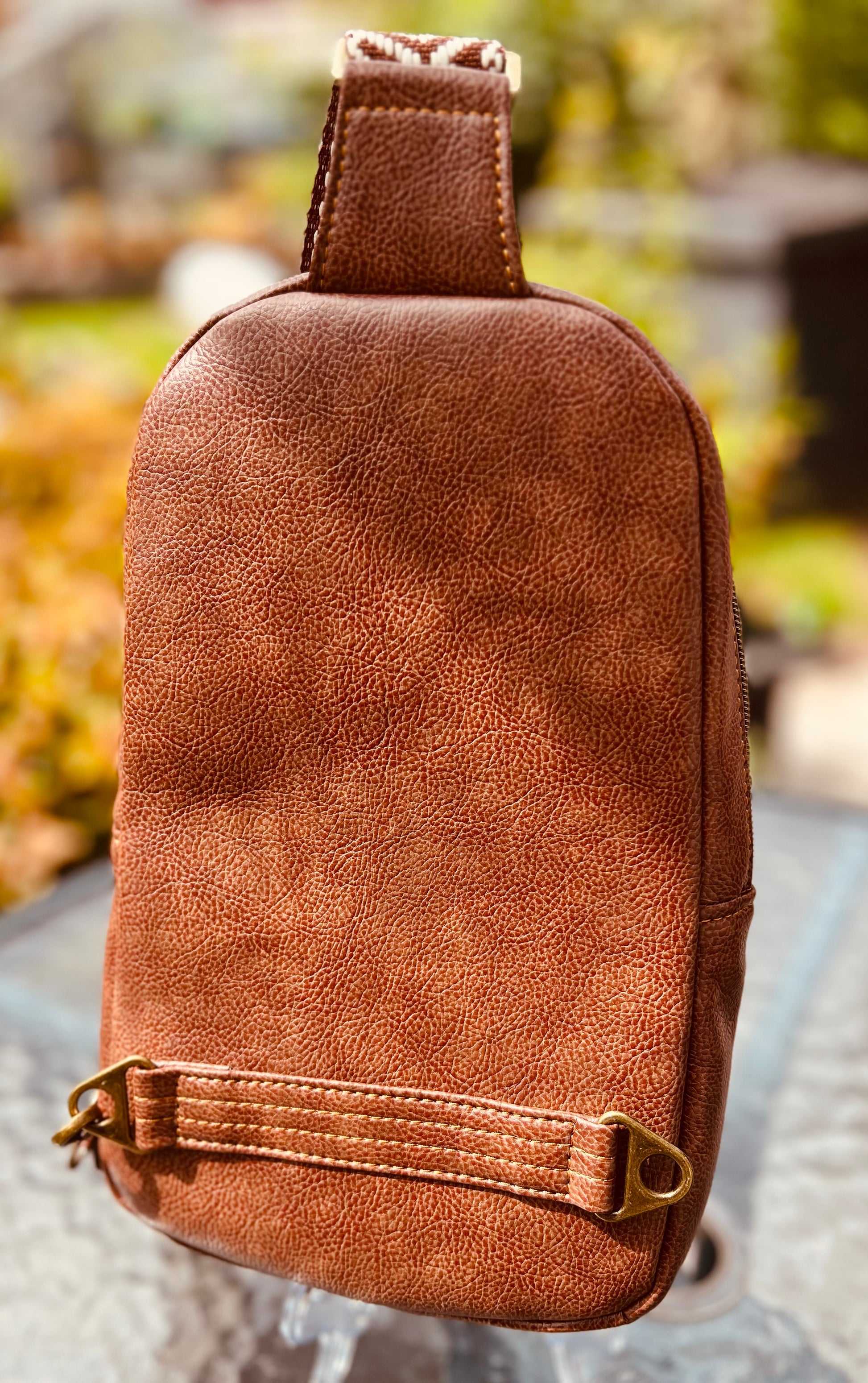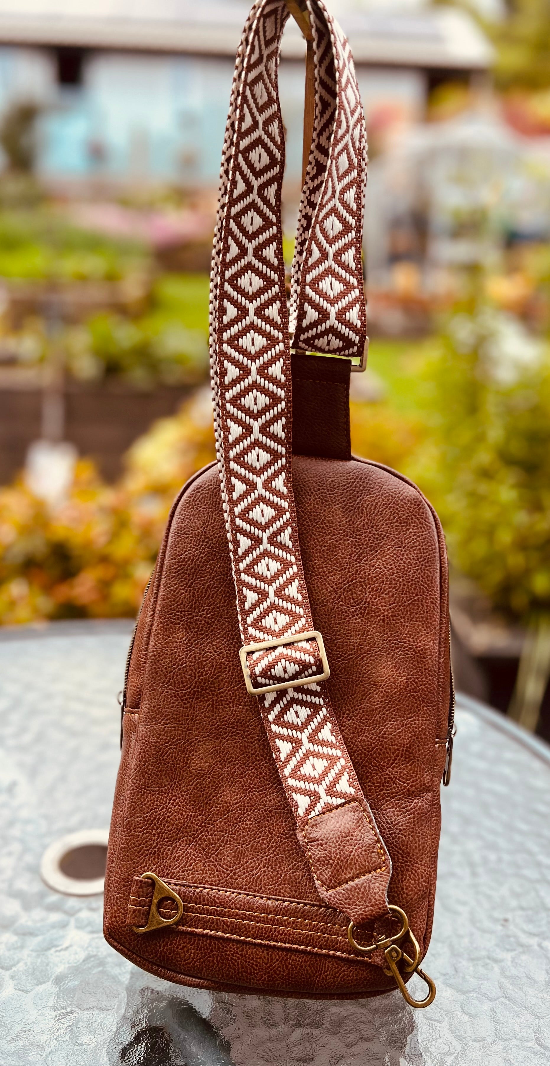 Rosie Sling - Medium sized sling backpack. The Rosie sling is a medium sized sling backpack for everyday use in the modern world, made from quality brown faux Leather with 3D denim front pocket with adjustable strap that can be worn left or right-hand side due to the duel clever strap connector. The Rosie Sling features a 3D front slip pocket with an interior deep slip pocket. Internally there is quality cotton liner with a deep slip pocket