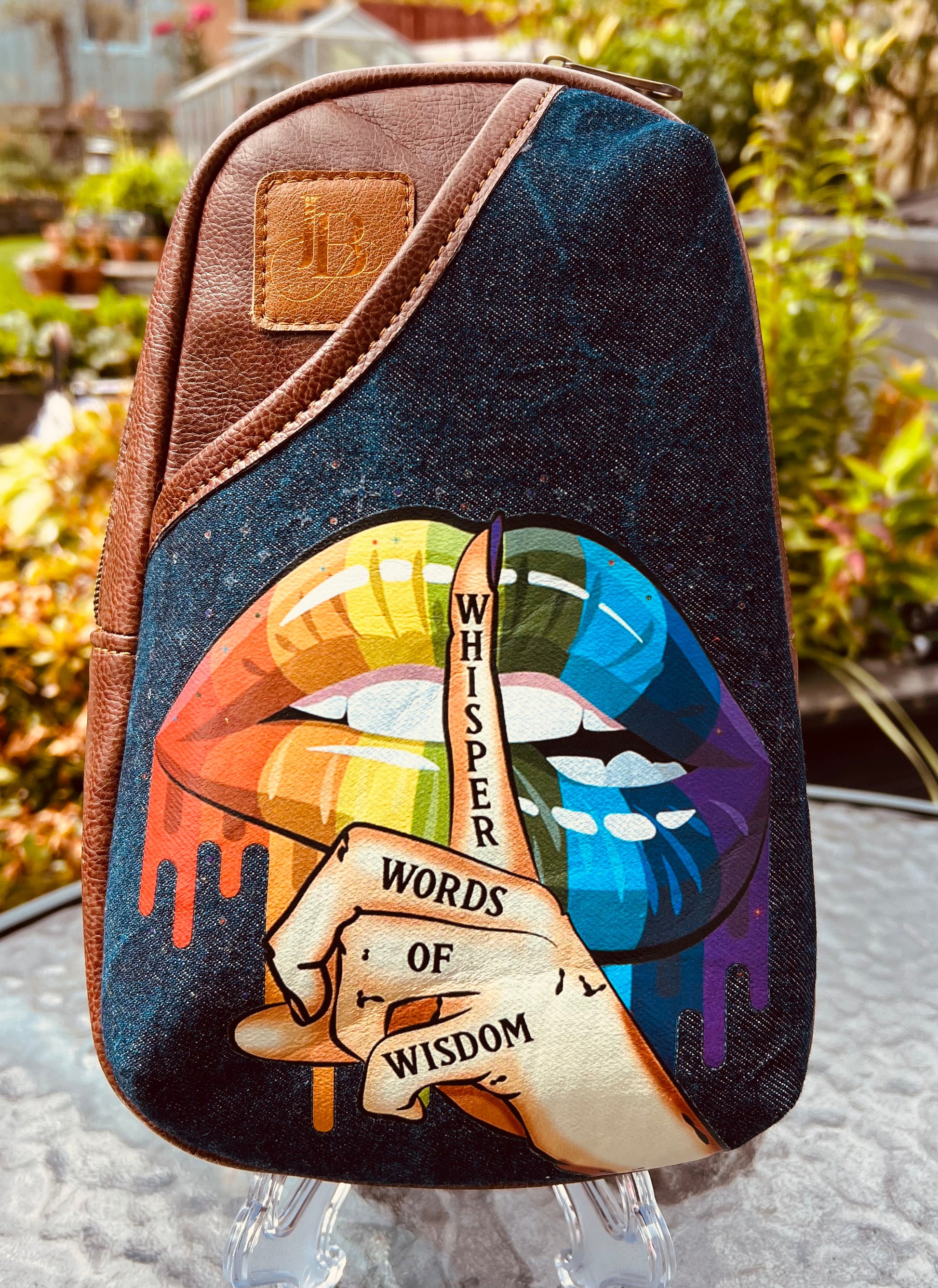 Exterior: Brown faux Leather with front denim 3D slip pocket with whisper words of wisdom transfer