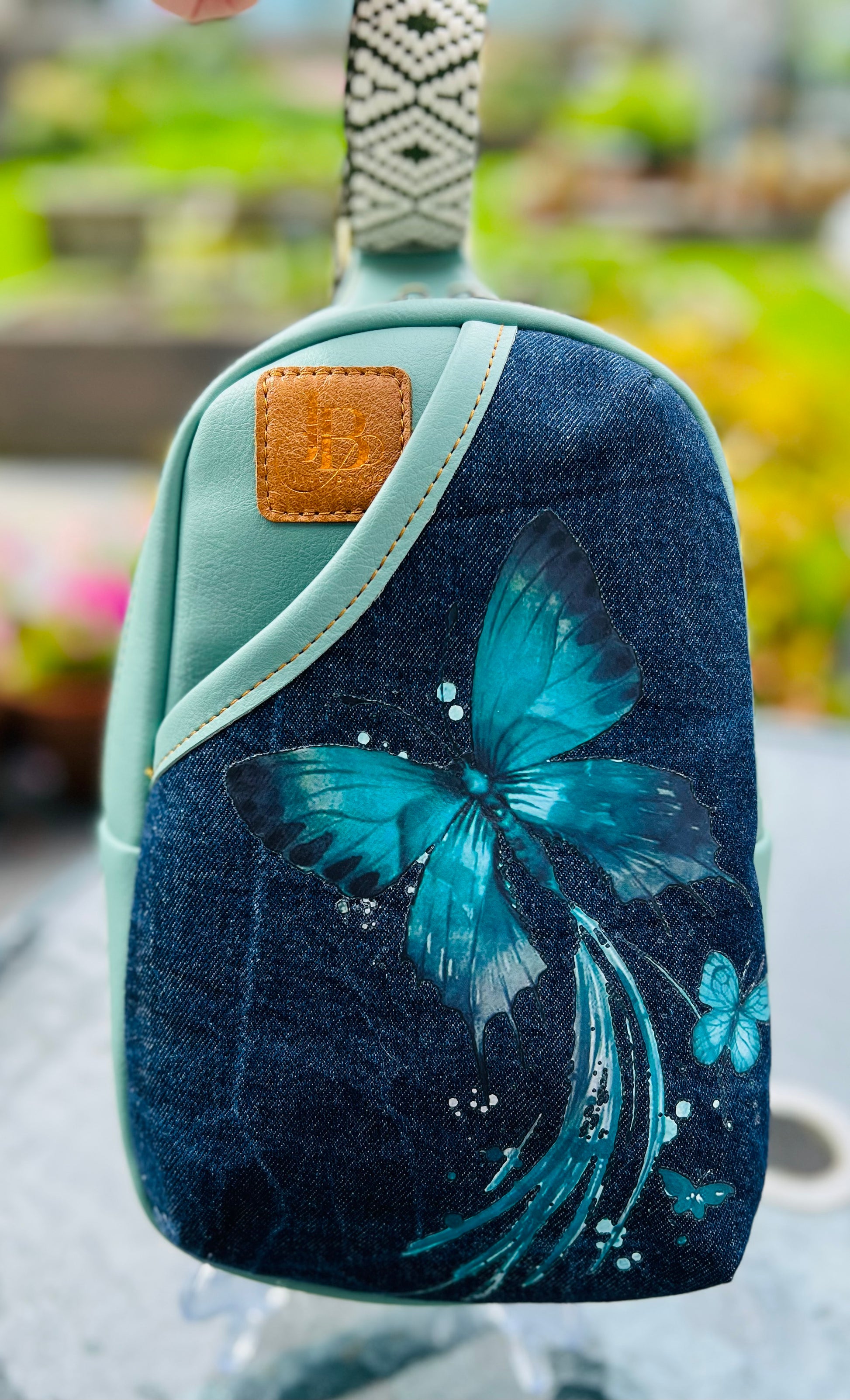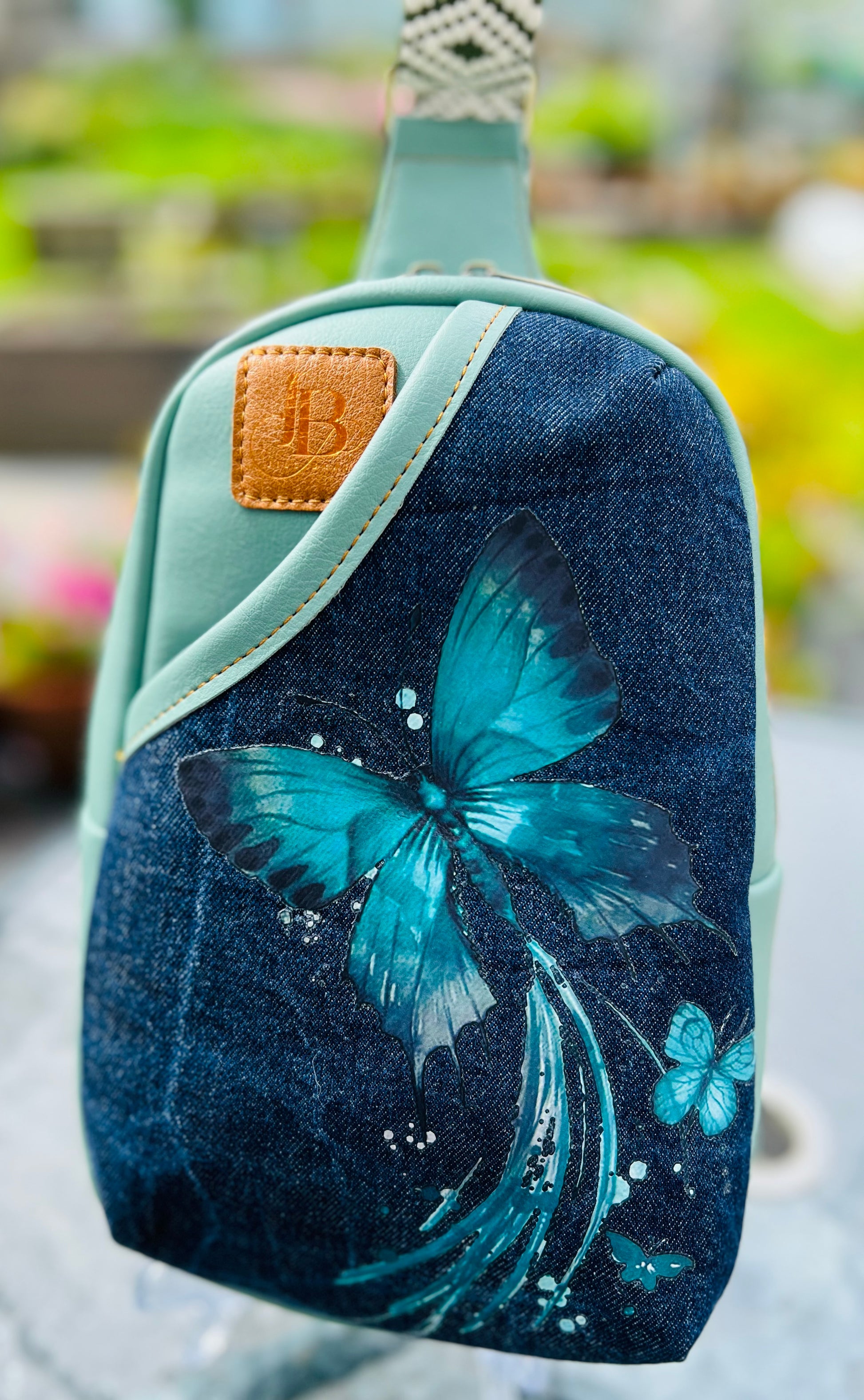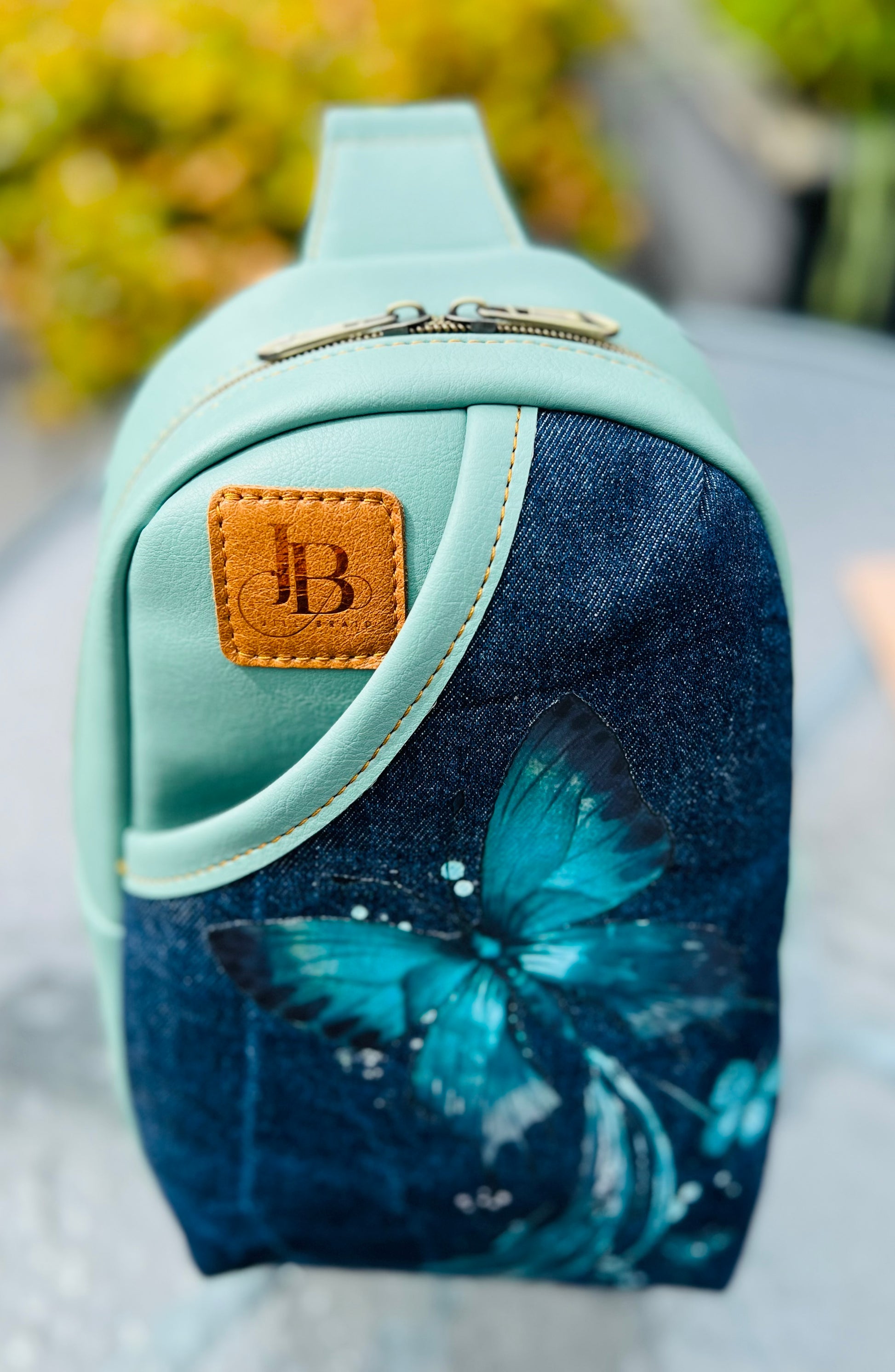 Exterior: Green faux leather with front denim 3D slip pocket with butterfly transfer