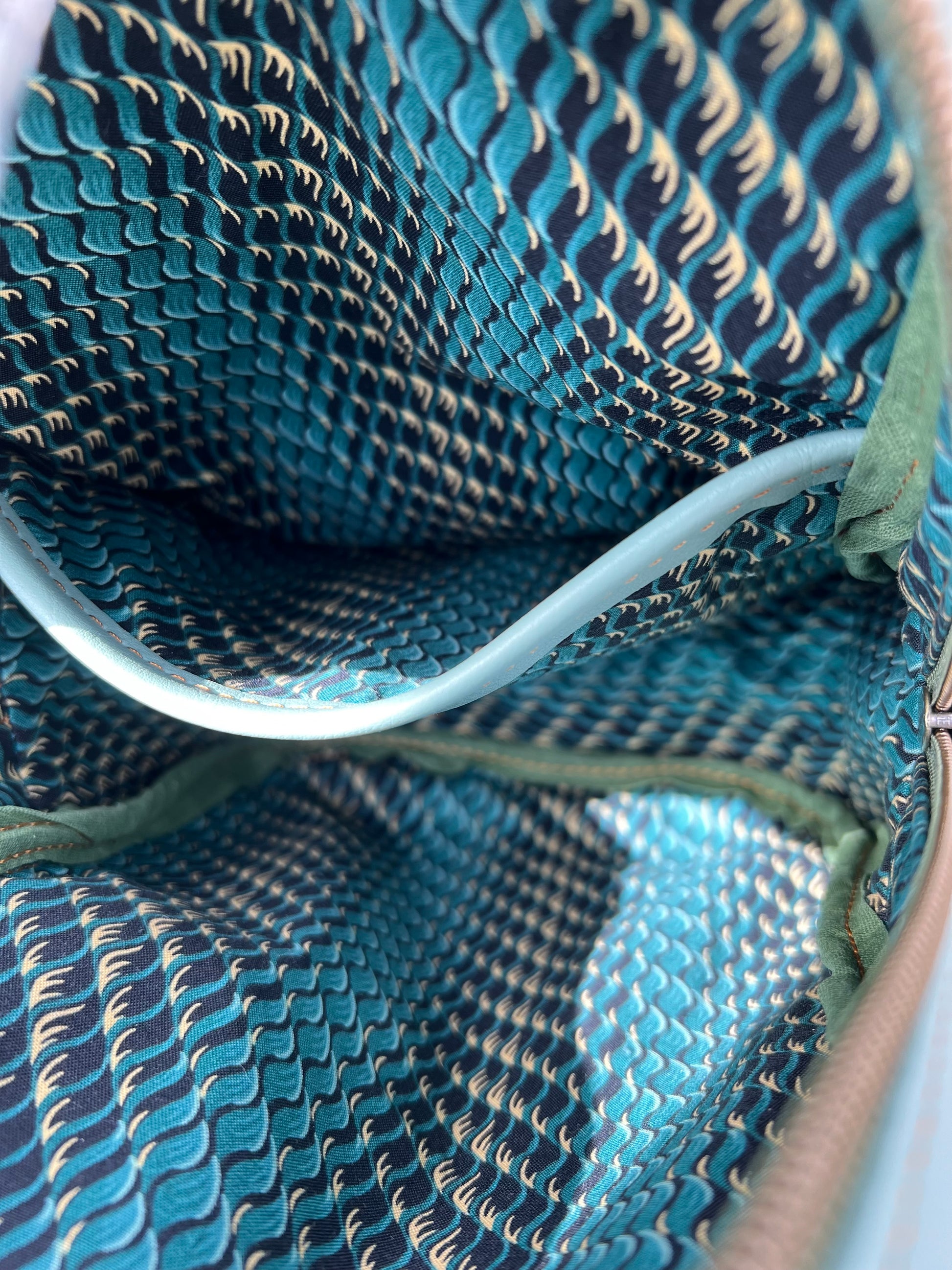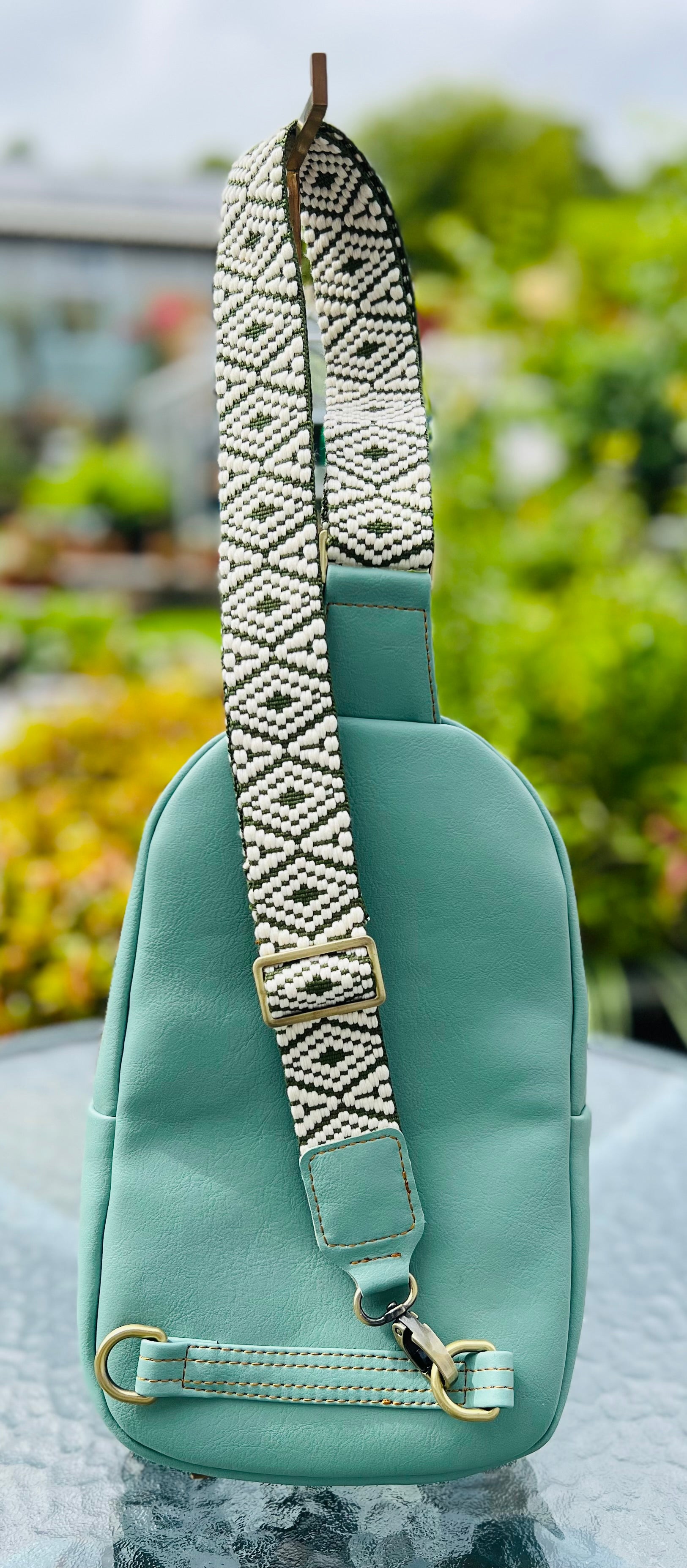Rosie Sling - Medium sized sling backpack. The Rosie Sling is a medium sized sling backpack for everyday use in the modern world, made from quality green faux Leather with 3D denim front pocket with adjustable strap that can be worn left or right-hand side due to the duel clever strap connector. The Rosie Sling features a 3D front slip pocket with an interior deep slip pocket. Internally there is quality cotton liner with a deep slip pocket.